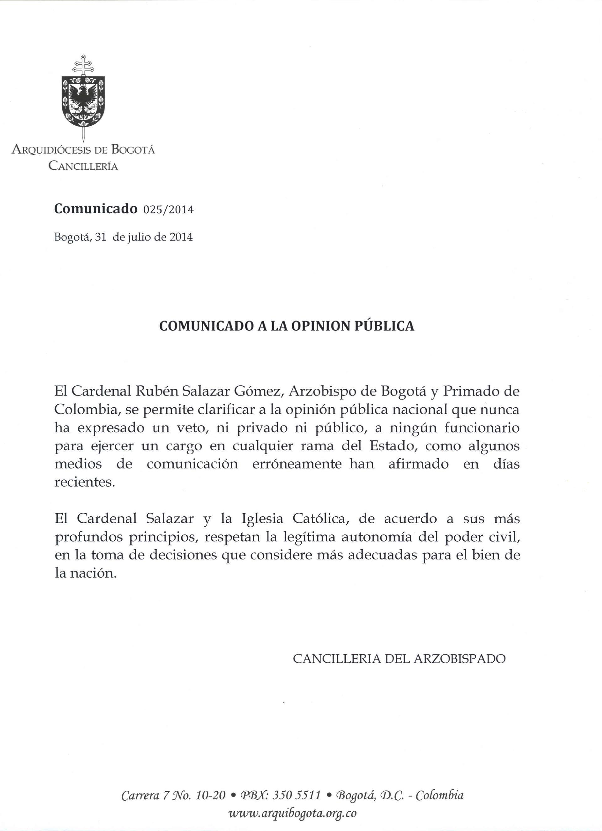 Centro de información Yo quiero Noticias Boletines Eventos Artículos Canonización Mensajes del Señor Cardenal Cartas pastorales Homilías Mensajes La voz del pastor Documentos del Vaticano BoletinesComunicado a la opinión pública, 31 de julio 2014 31 de Julio de 2014 " Nunca he expresado un veto, ni privado ni público, a ningún funcionario para ejercer un cargo en cualquier rama del Estado". Like 0 Dislike 0 Últimos boletines El señor Osvaldo Javier López descansa en la Casa del Padre21 de Octubre de 2025Elevamos plegarias al Señor de la vida como Iglesia arquidiocesana por el señor Osvaldo Javier, y oramos para que el Padre lo acoja en su Reino El padre Hernán Cimadevilla y Madrigal descansa en la Casa del Padre4 de Octubre de 2025Elevamos plegarias al Señor de la vida como Iglesia arquidiocesana por el padre Hernán y oramos para que el Padre lo acoja en su Reino