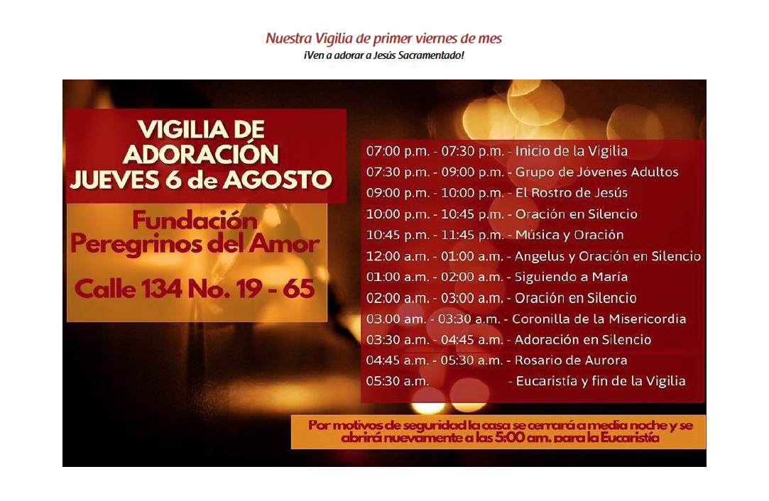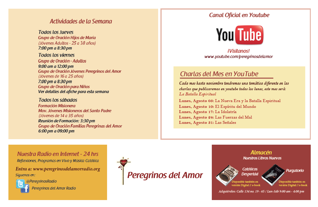 Centro de información Yo quiero Noticias Boletines Eventos Artículos Canonización Mensajes del Señor Cardenal Cartas pastorales Homilías Mensajes La voz del pastor Documentos del Vaticano NoticiasActividades del mes de agosto 201510 de Agosto de 2015 Like 0 Dislike 0 Noticias relacionadas Archivo del Plan de Predicación - 2024-2025 Tiempo para nutrir, cuidar y testimoniar la fe La Arquidiócesis de Bogotá celebró la ordenación de nuevos sacerdotes y diáconos