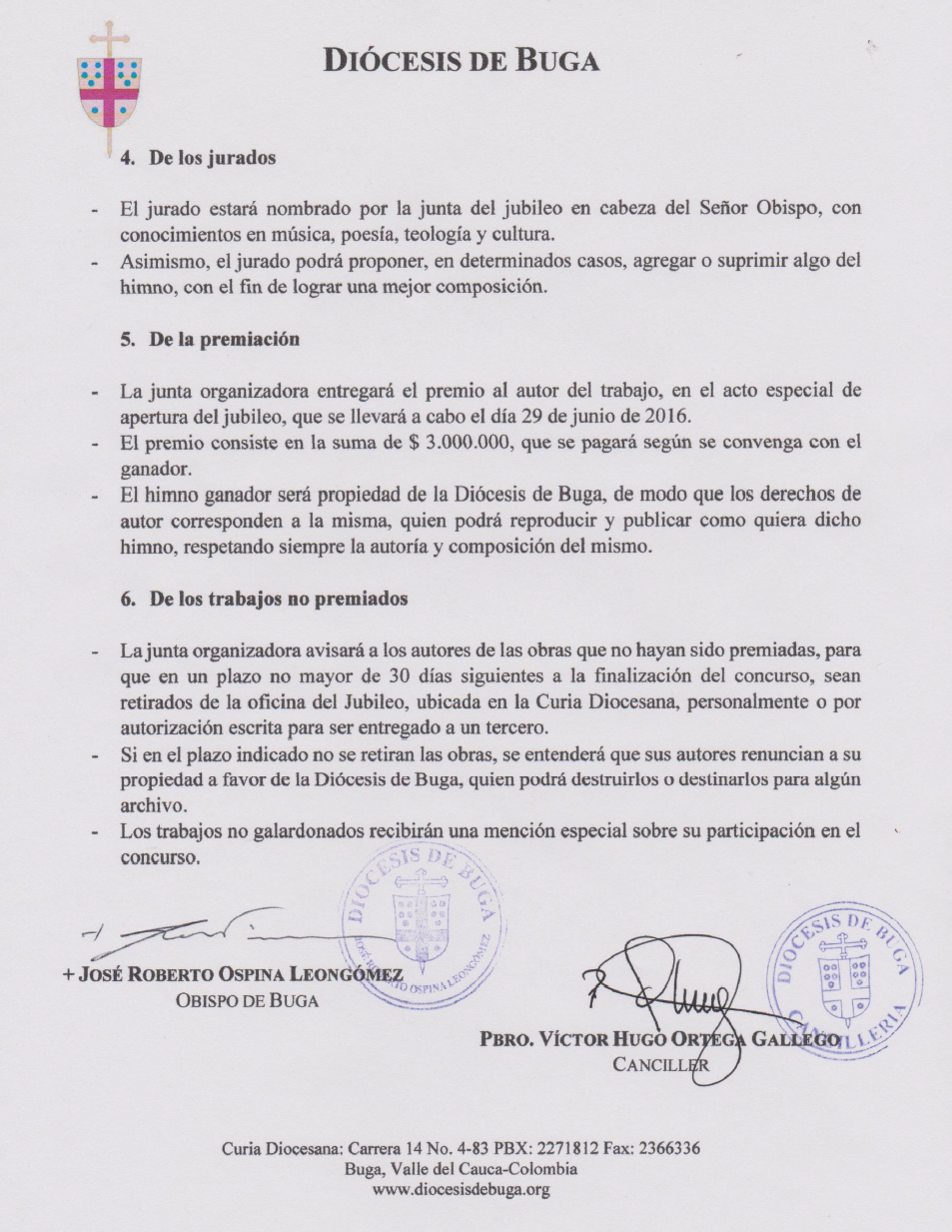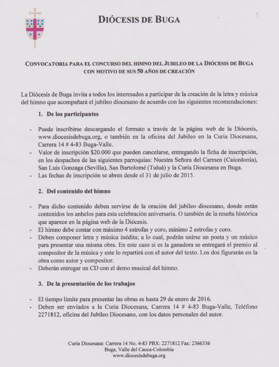 Centro de información Yo quiero Noticias Boletines Eventos Artículos Canonización Mensajes del Señor Cardenal Cartas pastorales Homilías Mensajes La voz del pastor Documentos del Vaticano NoticiasConvocatoria para el concurso del himno del Jubileo de la Diócesis de Buga con motivo de sus 50 años de creación9 de Octubre de 2015 Like 0 Dislike 0 Noticias relacionadas Archivo del Plan de Predicación - 2024-2025 Tiempo para nutrir, cuidar y testimoniar la fe La Arquidiócesis de Bogotá celebró la ordenación de nuevos sacerdotes y diáconos