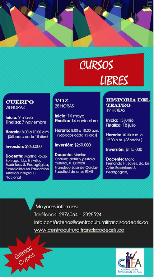 Centro de información Yo quiero Noticias Boletines Eventos Artículos Canonización Mensajes del Señor Cardenal Cartas pastorales Homilías Mensajes La voz del pastor Documentos del Vaticano NoticiasCursos libres Centro Cultural Francisco de Asís13 de Mayo de 2015 Like 0 Dislike 0 Noticias relacionadas Archivo del Plan de Predicación - 2024-2025 Tiempo para nutrir, cuidar y testimoniar la fe La Arquidiócesis de Bogotá celebró la ordenación de nuevos sacerdotes y diáconos