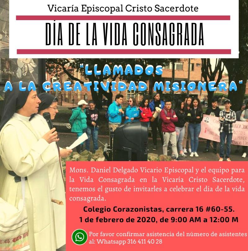 Centro de información Yo quiero Noticias Boletines Eventos Artículos Canonización Mensajes del Señor Cardenal Cartas pastorales Homilías Mensajes La voz del pastor Documentos del Vaticano NoticiasJornada Mundial de la Vida Consagrada31 de Enero de 2020La arquidiócesis de Bogotá, a través de las vicarías episcopales territoriales se une a la conmemoración de la Jornada Mundial de la Vida Consagrada que se celebrará el… Like 0 Dislike 0 Noticias relacionadas Archivo del Plan de Predicación - 2024-2025 Tiempo para nutrir, cuidar y testimoniar la fe La Arquidiócesis de Bogotá celebró la ordenación de nuevos sacerdotes y diáconos