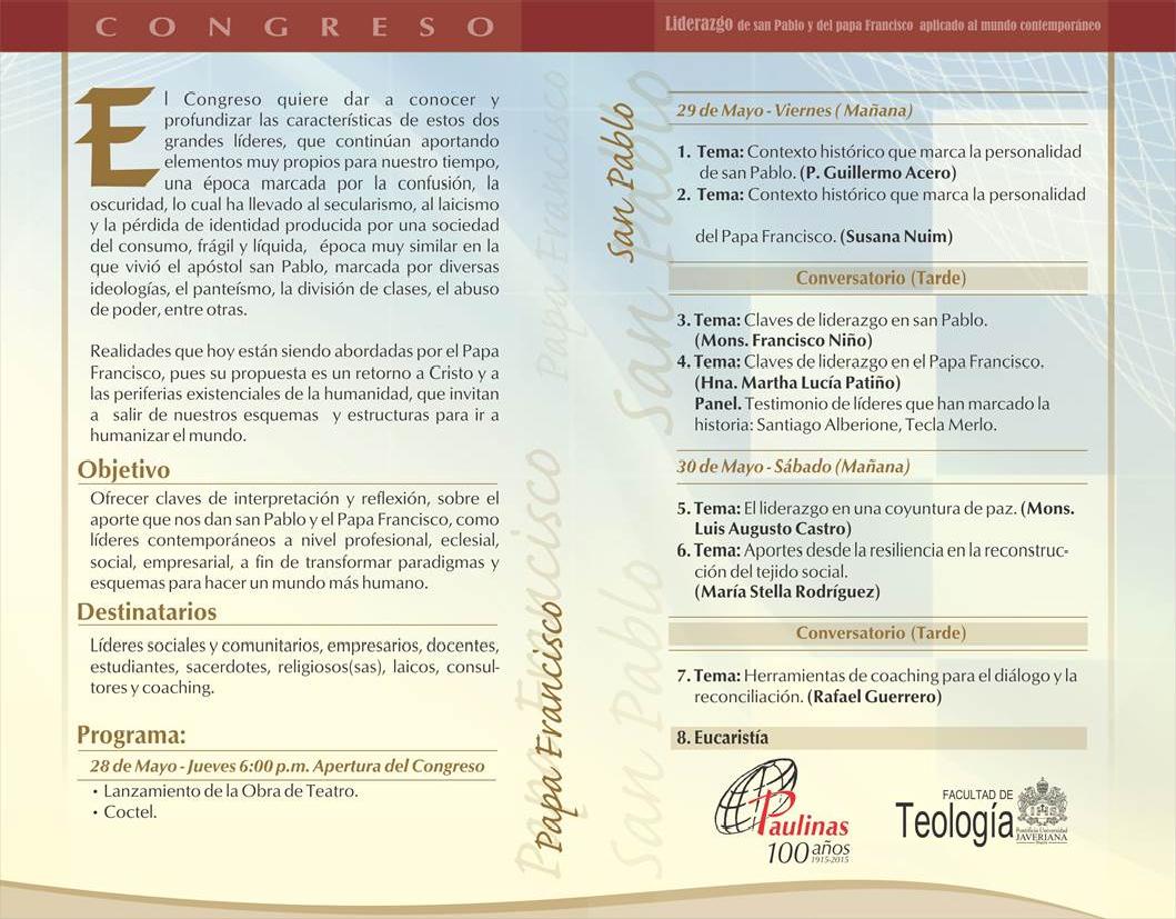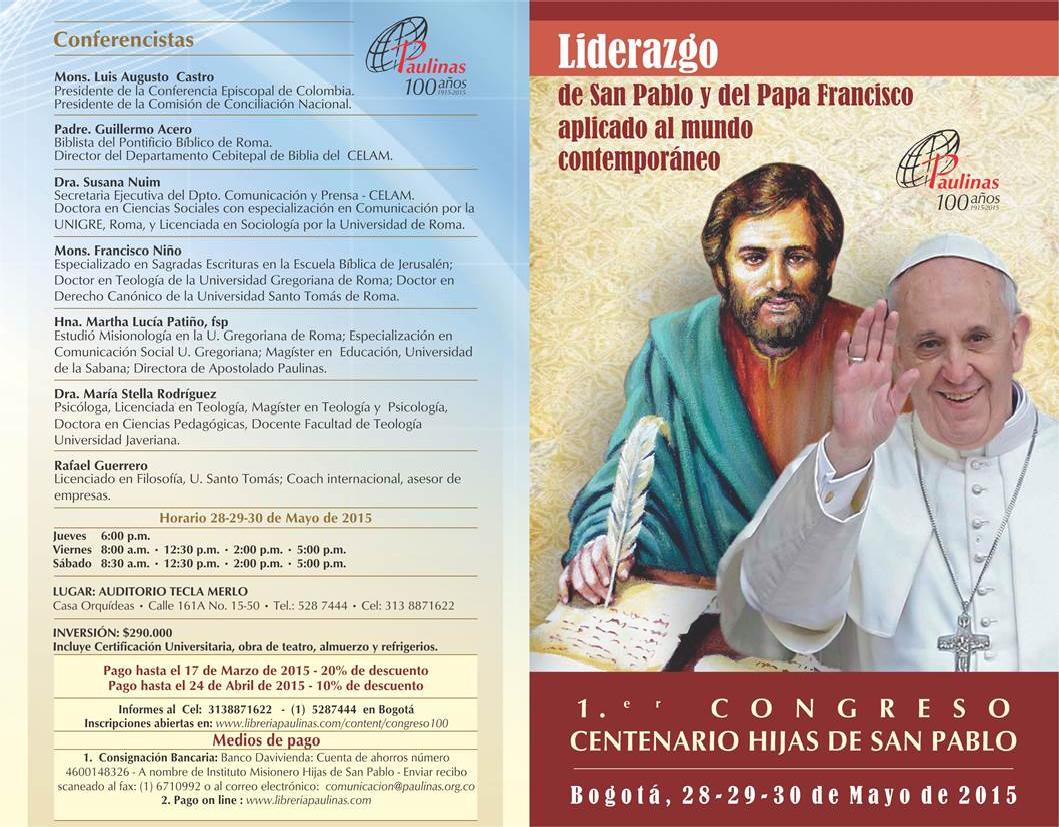 Centro de información Yo quiero Noticias Boletines Eventos Artículos Canonización Mensajes del Señor Cardenal Cartas pastorales Homilías Mensajes La voz del pastor Documentos del Vaticano NoticiasPrimer Congreso: Liderazgo de San Pablo y del Papa Francisco aplicado al mundo contemporaneo27 de Mayo de 2015Para mayor información haz clink en el siguiente link: http://libreriapaulinas.com/congreso Like 0 Dislike 0 Noticias relacionadas Archivo del Plan de Predicación - 2024-2025 Tiempo para nutrir, cuidar y testimoniar la fe La Arquidiócesis de Bogotá celebró la ordenación de nuevos sacerdotes y diáconos