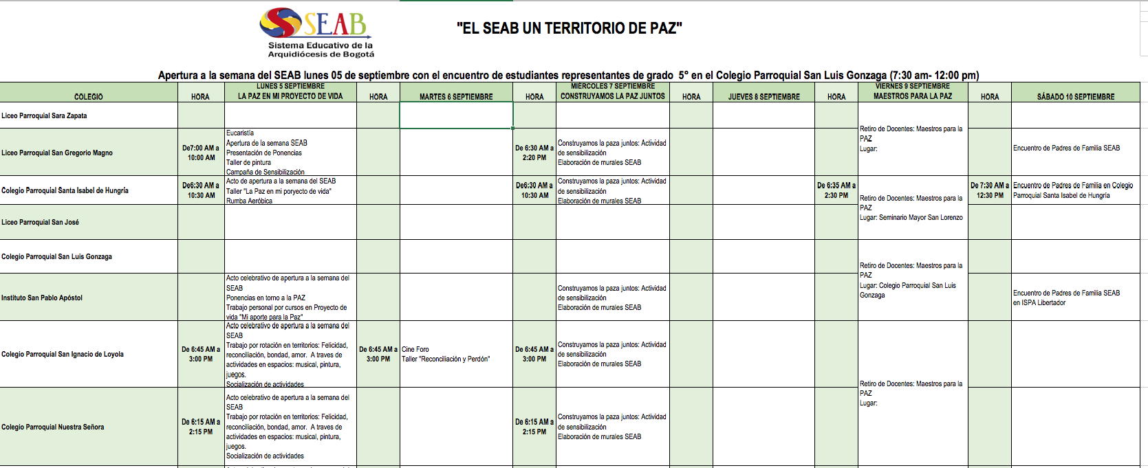 Centro de información Yo quiero Noticias Boletines Eventos Artículos Canonización Mensajes del Señor Cardenal Cartas pastorales Homilías Mensajes La voz del pastor Documentos del Vaticano NoticiasProgramaciónEl SEAB un territorio de Paz5 de Septiembre de 2016Descargue la programación a continuación:Programación semana del SEABDescargar Like 0 Dislike 0 Noticias relacionadas Archivo del Plan de Predicación - 2024-2025 Tiempo para nutrir, cuidar y testimoniar la fe La Arquidiócesis de Bogotá celebró la ordenación de nuevos sacerdotes y diáconos